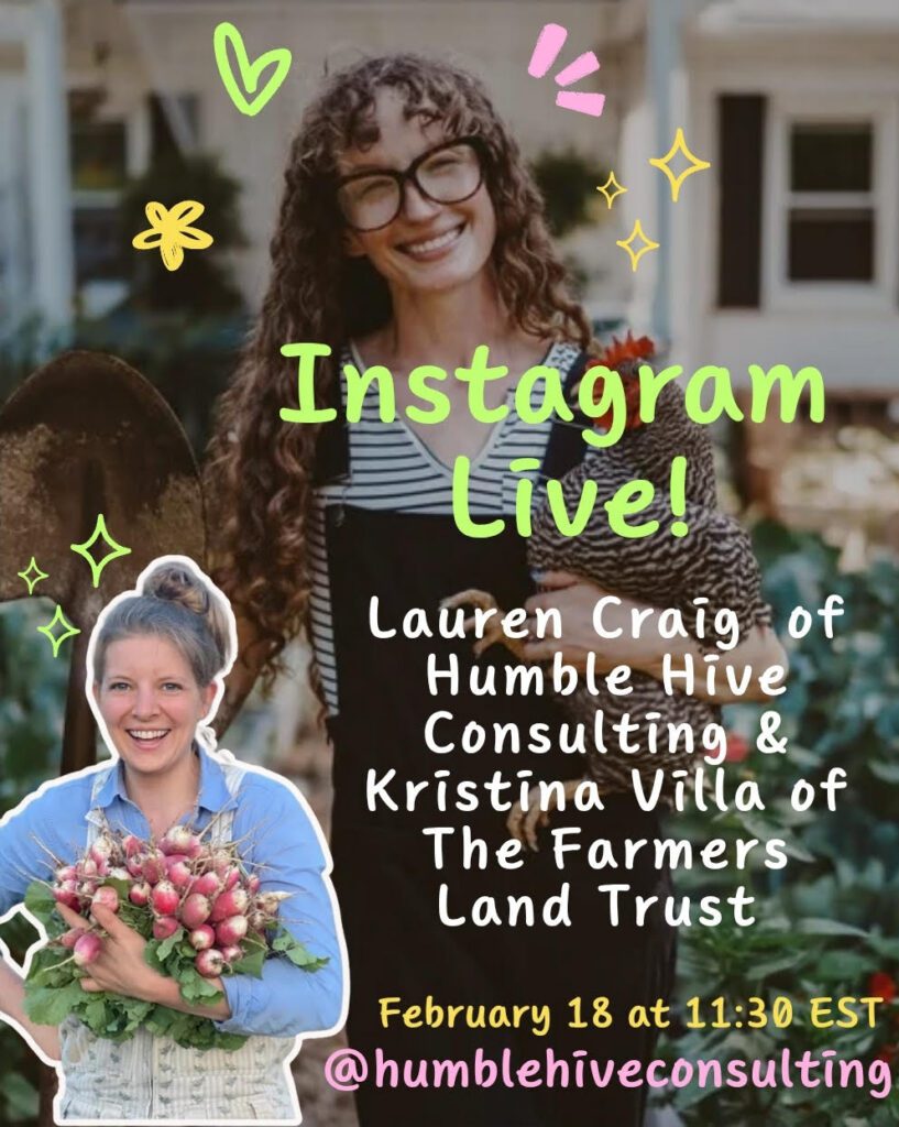 Tune into @humblehiveconsulting on Instagram for a conversation with Lauren Craig Humble Hive Consulting and Kristina Villa of The Farmers Land Trust.